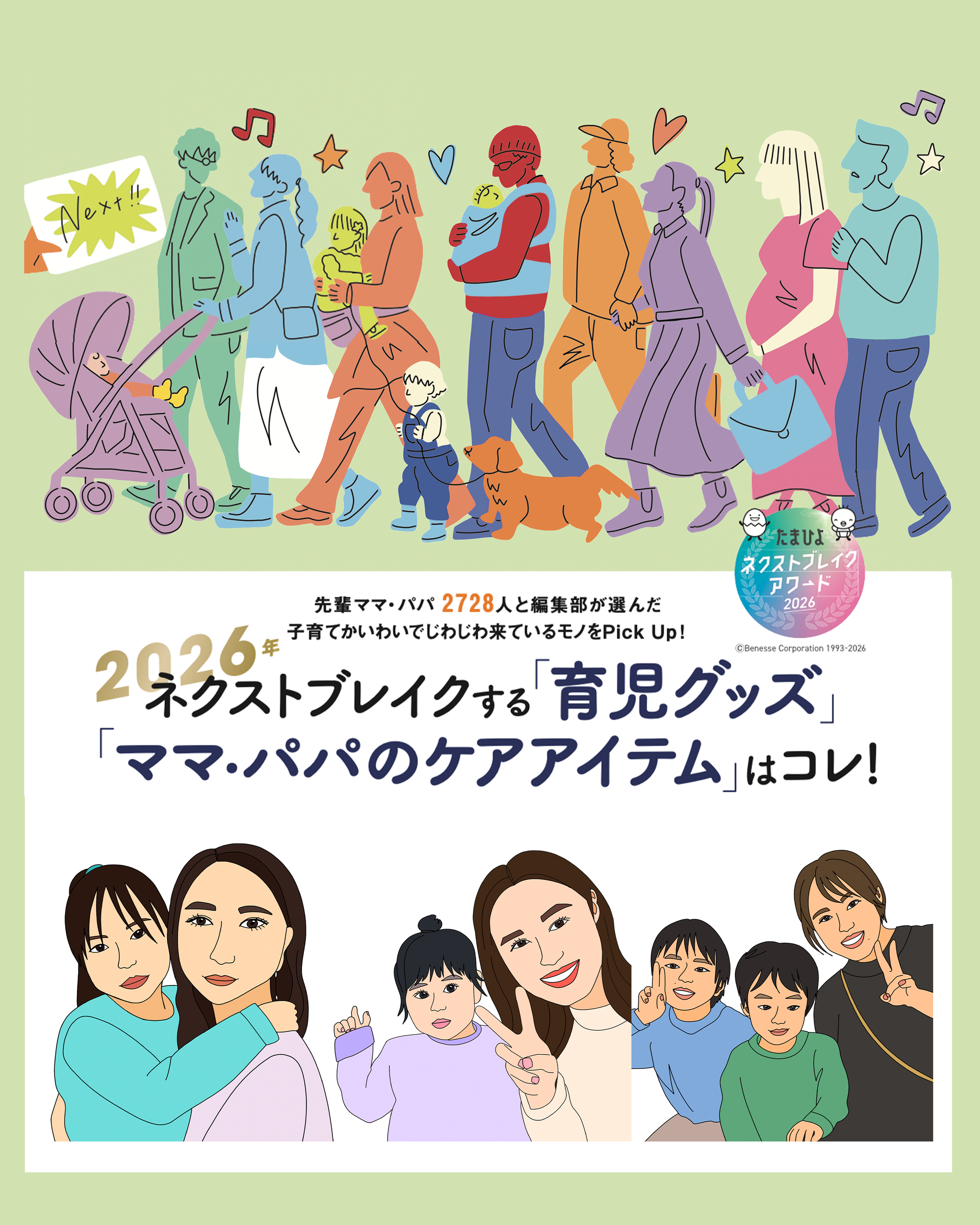 -後期のたまごクラブ』春号 2026「【特集】2026年 ネクストブレイクする「育児グッズ」「ママ・パパのケアアイテム」はコレ!」 / 扉絵と似顔絵イラスト